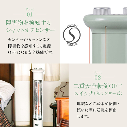 0.2秒で発熱!しっかり暖かい「グラファイトeヒーター」+障害物が赤外線センサーをさえぎると、自動で電源をOFFにする「シャットオフセンサー」