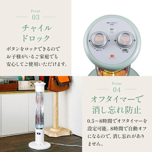 「0.5~8時間自動オフタイマー」「チャイルドロック」「防災対応型 二重安全転倒OFFスイッチ(光センサー式)」
