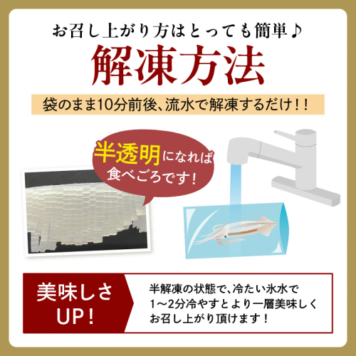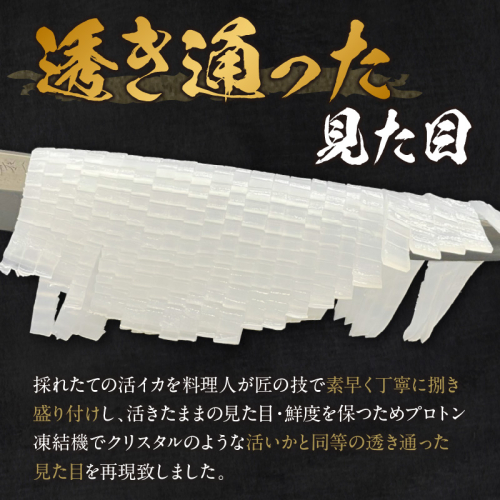 採れたての活イカを料理人が匠の技で素早く丁寧に捌き盛り付けし、活きたままの見た目・鮮度を保つためプロトン凍結機でクリスタルのような活いかと同等の透き通った見た目を再現致しました。瞬間冷凍することで旨みを閉じ込め、生の状態より甘みを感じられる状態になります。