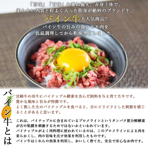 「旨味」「甘味」を兼ね備え、赤身主体で、柔らかい肉質と程よく入った脂身が絶妙のパイン牛大人気商品!旨みの強いモモ肉を低温調理してから粗挽きにしました。 ------------------------ 原材料名 宮崎県産黒毛和牛 保存方法 冷凍 ギフト対応 ※のし等のギフト対応をしておりません。ご了承ください。 【地場産品に該当する理由】 返礼品の主要部分を占めるパイン牛。牛肉が7割(肥育部分)区域内で生産しているため。(告示第5条第2号に該当)