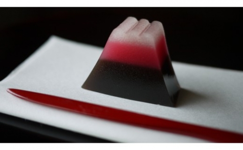 富士山羊羹小倉は、赤富士を想像して作りました。頂上の雪、中央赤富士は白いんげん豆を使用して、裾野は小倉粒餡を使用し、じっくり練り上げ3層の上品なお味の羊羹を作り上げました。