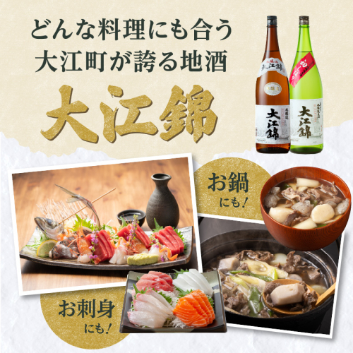 【配送不可:沖縄県・離島】 大江町の酒米を大江町の水で仕込んだお酒「大江錦」です。大江町内の酒店でしか取り扱えない本外不出の酒です。大江町民が一丸となって、米作りから始め、手づくりからうまれた天然の味をどうぞ。 【注意事項】 ※画像はイメージです。 ※20歳未満の方の飲酒は法律で禁止されています。20歳未満の方のお申し込みは受け付けておりません。 【地場産品に該当する理由】 原材料の主要な部分(酒米)を100%町内で生産したものを使用しているため。(告示第5条第2号に該当)