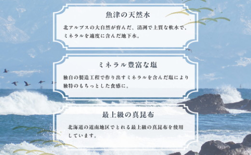 富山県魚津市は、日本海側で最も深い湾「富山湾」から2,000m級の「北アルプス」までの距離が約25kmという、世界でも稀にみる急勾配の地形が特徴です。 富山湾では古くから漁業が盛んで、魚津港にはホタルイカやベニズワイガニ、ブリをはじめとした新鮮な魚介類が豊富に水揚げされます。 水産加工会社も多く、蒲鉾や昆布じめ、鱒寿司は郷土料理としても長い歴史があります。 山からの清らかな雪解け水は、魚介類だけでなく、さまざまな農産物を育んでおり、魚津産コシヒカリや加積りんご、下野方なし、西布施ぶどうは、生産量は少ないながらも、隠れた人気があります。 この機会にぜひ、魚津の逸品をお楽しみいただけたら幸いです。