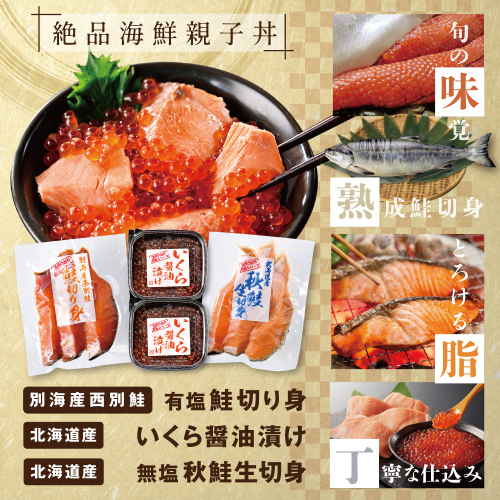 【お礼品の内容・特徴】 鮭切り身は無塩、塩漬けともに一番脂の乗った時期の魚を使用しています。 塩鮭は山漬けの熟成された鮭を切り身にしています。 イクラ醬油漬けは9月下旬から10月中旬に漁獲された鮭から良質の卵を醤油漬けしました。 鮭切り身は焼き、フライ、ムニエル等、イクラ醤油漬けは手巻き寿司や鮭のほぐし身と親子丼がおススメです。