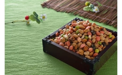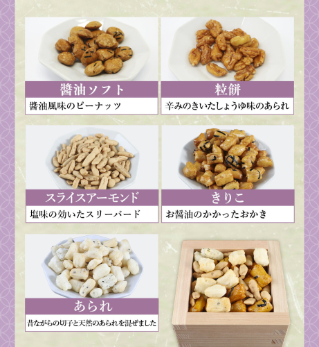 海老、醤油、海苔など、とりどりの小粒豆菓子におかき、グリンピースなどをミックスした「次はどの味にしようかな」とついつい手がでる一品となっています。
