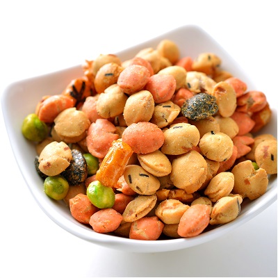 海老、醤油、海苔など、とりどりの小粒豆菓子におかき、グリンピースなどをミックスした「次はどの味にしようかな」とついつい手がでる一品となっています。