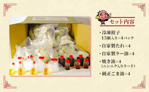 15個入り×4パック(冷凍餃子)、自家製たれ×4、自家製ラー油×4、焼き油(ニンニク入りラード)×4、純正ごま油×4