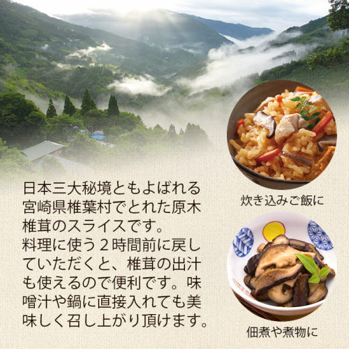宮崎県 椎葉村 宮崎 椎葉 宮崎県産 国産 原木椎茸 乾し椎茸 椎茸 しいたけ シイタケ 干し椎茸 原木栽培 産地直送 スライス グアニル酸 ビタミンD おすすめ 乾物 きのこ 栄養 美容 食物繊維 煮物 みそ汁 汁もの ダシ お鍋 鍋 特産 特産品 ご当地 お取り寄せ 保存食 備蓄 多用途 便利 ギフト 贈物 贈答品 プレゼント お中元 お歳暮