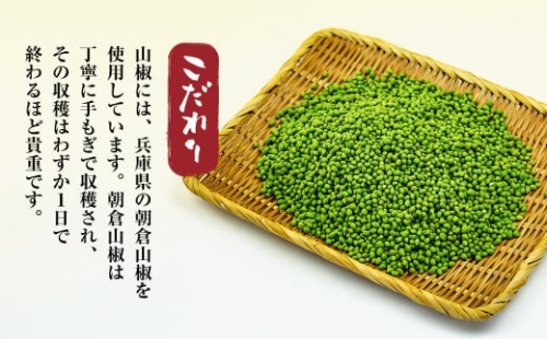 山椒は、兵庫県の朝倉山椒を使用しています。朝倉山椒は丁寧に手もぎで収穫され、その収穫はわずか1日で終わるほど貴重です。西山佃煮では、生の山椒を使って炊き上げており、その香りは高く、やさしいさっぱりとした辛味が特徴です。この山椒昆布は、真昆布を朝倉山椒とともに長年培った佃煮作りの製法で、柔らかく炊き上げました。