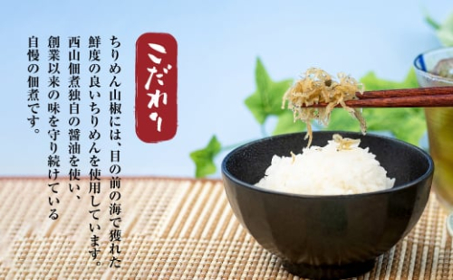 ちりめん山椒には、淡路島の前の海で獲れた鮮度の良いちりめんを使用しています。創業以来の味を守り続けている佃煮は、西山佃煮独自の醤油を使い、香り豊かな兵庫県の朝倉山椒を使用しています。また、砂糖には上質なザラメを使い、日本産の上質原材料にこだわって贅沢な佃煮に仕上げています。