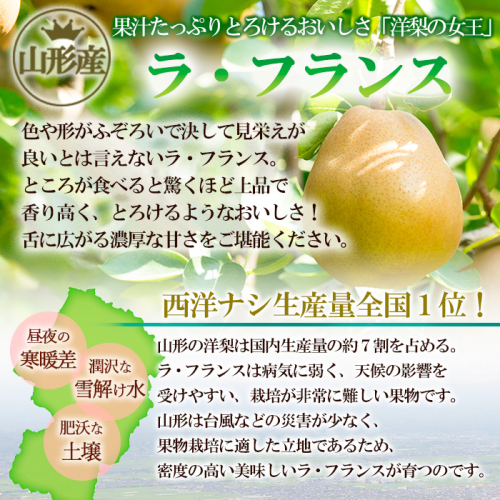 山形連携中枢都市圏における共通返礼品です。関係市町(山形市、寒河江市、村山市、尾花沢市、山辺町、中山町、河北町、西川町、朝日町、大江町、大石田町)で栽培されたラ・フランスをお届けします。