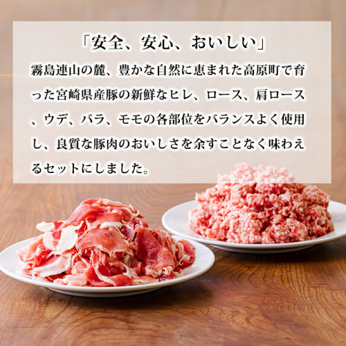 自然豊かな高原町で育った宮崎県産豚の新鮮なヒレ、ロース、肩ロース、ウデ、バラ、モモの各部位をバランスよく使用し、良質な豚肉のおいしさを余すことなく味わえるセットにしました。