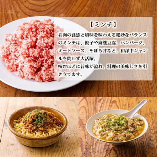 赤身と脂のバランスが絶妙なミンチは、お肉の食感と風味を感じることができ、餃子や麻婆豆腐、ハンバーグ、ミートソース、そぼろ丼など、様々なジャンルのメニューにご利用いただけます。