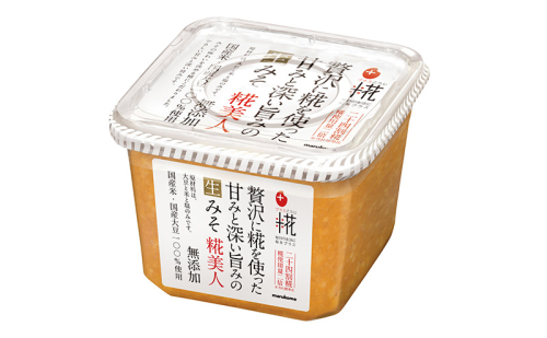 糀の粒が残った淡色系の粒みそです。国産米100%使用で食品添加物は無添加です。だしは入っていません。また、みそは未加熱ですので酵母の働きによる容器の膨らみを防ぐため天面フィルムに通気口がついています。