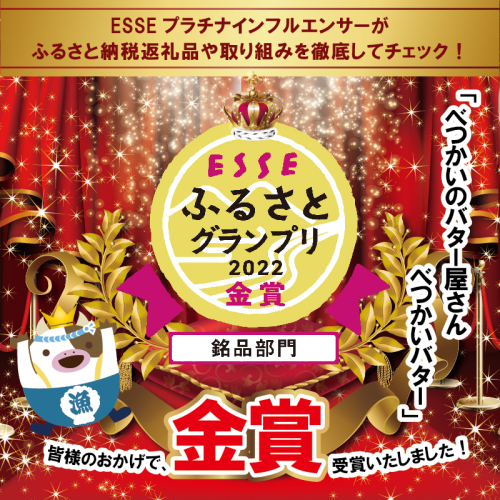 ふるさと納税返礼品の全国コンテスト「ESSEふるさとグランプリ2022」にて、「北海道産 べつかいのバター屋さん べつかいバター」が銘品部門で金賞を獲得しました。