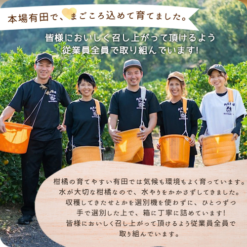 柑橘の育てやすい有田では気候も環境もよく育っています。水が大切な柑橘なので、水やりをかかさずしてきました。収穫してきたはるみを選別機を使わずに、ひとつずつ手で選別した上で、箱に丁寧に詰めています!皆様においしく召し上がって頂けるよう従業員全員で取り組んでいます。