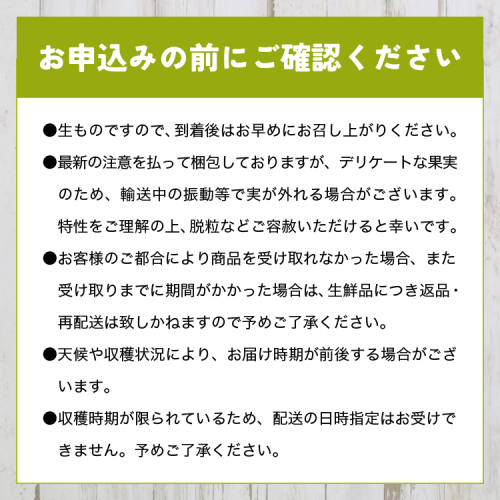 当園のシャインマスカットの表面には「かすれ」がありますが、これは糖度が上がるにつれて出てくるもので、甘みのバロメーターです。キズや痛みではありませんので、安心してお召し上がりください。