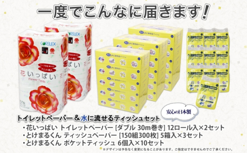 さわやかな香り付き 花いっぱいトイレットペーパーと水に流せるとけまるくん ボックスティッシュ・ポケットティッシュをセットにしてお届けします。