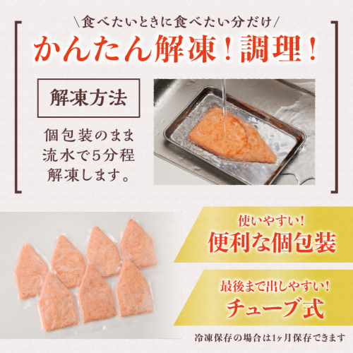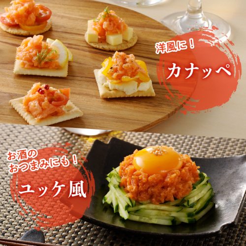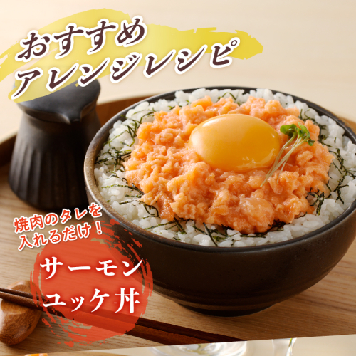 【説明】厳選した脂が乗ったサーモンをたたきに仕上げました。たたきにすることで更に旨みが増します。80g×7パックで個包装にしてありますので、食べたい時に流水で5分程解凍すれば美味しく食べられます。食べない分は冷凍庫に保存すれば1ヶ月保存出来ますので、ご家庭でも調理に重宝して頂けます。たたきとしてそのまま食べてもいいですし、おすすめは5分程で簡単に作れるサーモンユッケ丼(焼き肉のタレを入れるだけで簡単ですよ!)やおつまみとして焼肉のタレを入れてユッケ風にしてそのまま食べたり、クラッカーにのせて食べるなど、様々な調理法がありますのでご家庭でも重宝して頂けると思います。このように、濃厚で油バッチリのサーモンを是非ご賞味下さいませ。