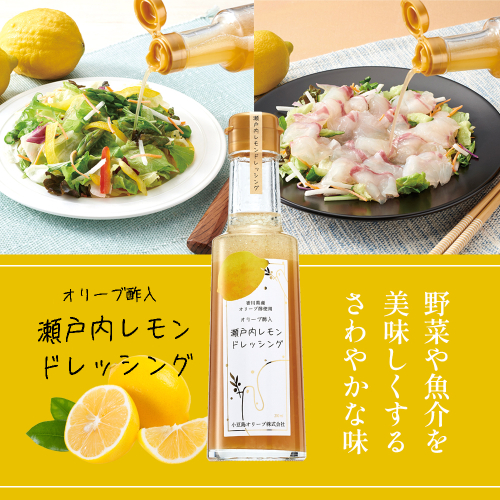 瀬戸内レモン、食用オリーブオイル、オリーブだけを発酵したオリーブ酢を使用し、スッキリさわやかな味に仕上げました。 野菜はもちろん魚介類にも合う上品な味で、普段の食事も華やかなお料理も、より一層美味しいひと皿に。