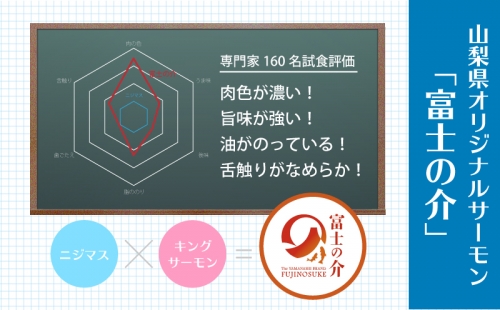 山梨県は富士山をはじめ国内屈指の名峰に囲まれ、清らかな水で育った「富士の介」は、 10年をかけてキングサーモンとニジマスを交配し開発した山梨県オリジナルのサーモンです。 2年~3年をかけてじっくり育てたきめ細かい食感と上品な脂が自慢です。 刺身、カルパッチョ、サラダに最適です。 解凍後はなるべくお早めにお召し上がりください。 発送は受注状況により前後する可能性がございます。