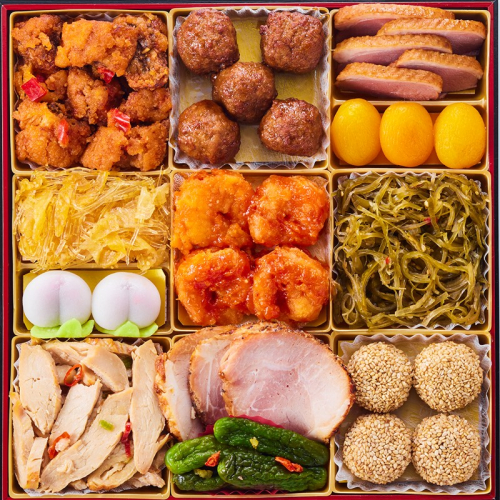 あっさりザーサイ30g、黒糖黒酢の国産肉団子6個、ふかひれ風中華くらげ40g、鶏中華テリーヌ5枚、国産黒糖焼き豚5枚、あんず甘露煮2個、若桃甘露煮2個、桃花餅2個、海老のチリソース煮5個、豚タン炭火焼60g、中華わかめ冷菜50g、合鴨ロース4枚、胡麻団子4個、にしんチリソース50g