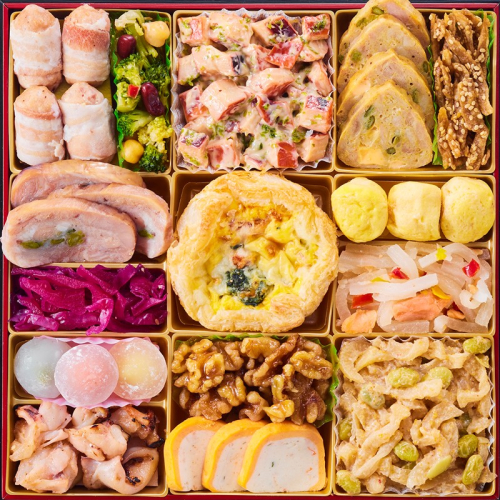 国産紫キャベツのピクルス40g、若鶏ワイン焼き4枚、メープルくるみ40g、ベーコンチーズオードブル4個、手羽元黒胡椒焼き4個、彩りマリネ50g、数の子と枝豆のサラダ50g、さつまいも甘露煮2個、チーズごぼう30g、ブロッコリーの彩りレモンサラダ50g、チーズ焼きイカ40g、三色雪玉餅3個