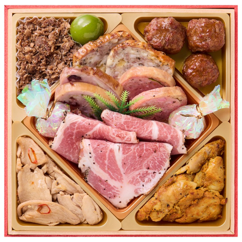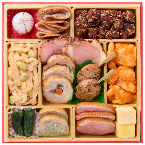 たこの旨煮3個、味付数の子3本、手まり花餅1個、黒糖黒酢の国産肉団子3個、有頭海老の艶煮3尾、伊達巻3枚、牛肉の佃煮30g、サラミ風チーズ鶏肉巻4枚、若桃甘露煮2個、若鶏ワイン焼き4枚