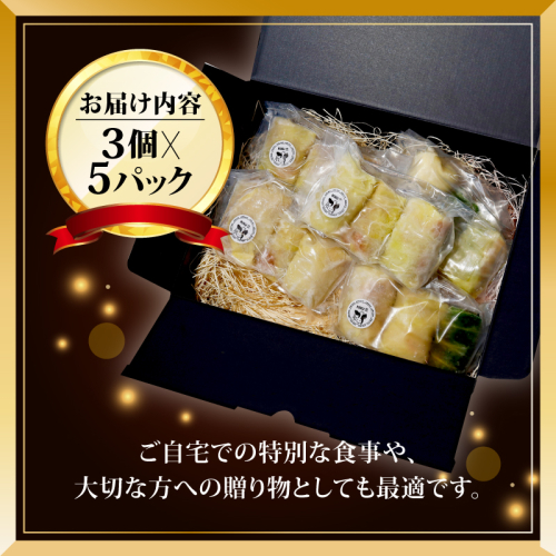 黒毛和牛と国産豚の合挽ロールキャベツを3個入×5パック、合計15個お届けします。