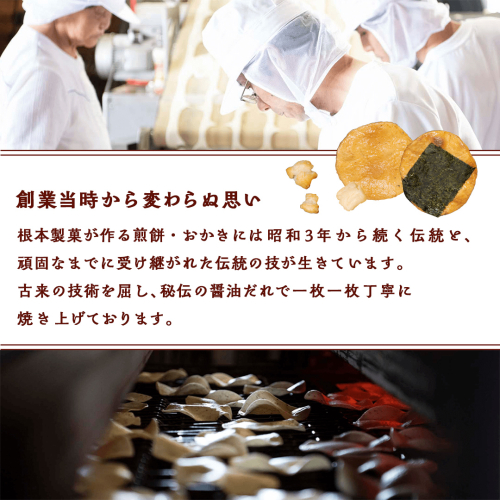 根本製菓の「おせんべい」は、素材の味にこだわり茨城県産米を100%使用し、伝統と古来の技術を屈して、一枚一枚丹精込めて焼き上げています。