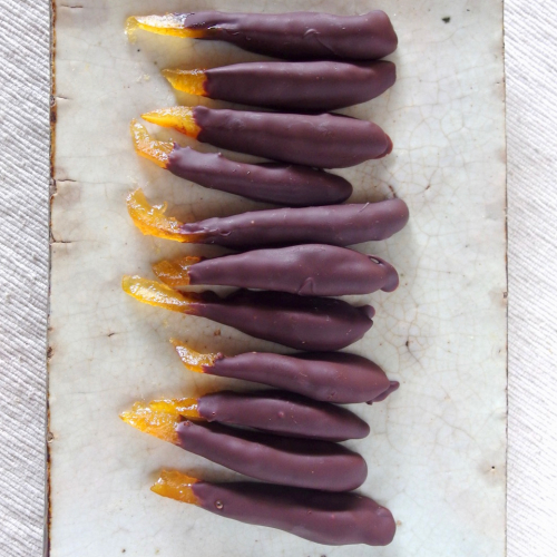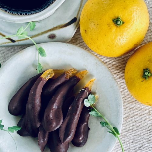 宮崎県綾町産自然栽培日向夏の皮をオーガニック粗糖で長時間かけて煮込んで作った自社製ピールに、カカオ60%のオーガニッククーベルビターチョコをテンパリングして、1本1本手で丁寧に作った手作りピールチョコです。
