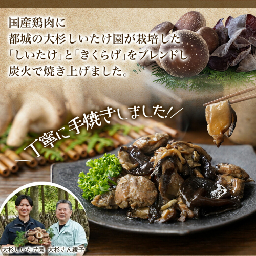 国産鶏肉に都城の大杉しいたけ園が栽培した「しいたけ」と「きくらげ」をブレンドし、手焼きの炭火で丁寧に焼き上げました。