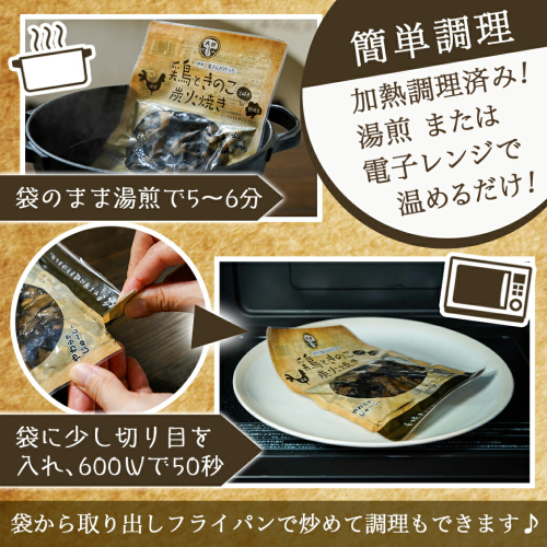 国産鶏肉に都城の大杉しいたけ園が栽培した「しいたけ」と「きくらげ」をブレンドし、手焼きの炭火で丁寧に焼き上げました。 味付けは塩と一味唐辛子のみ、あっさりとしています。 おかずはもちろん、都城産の焼酎やビール、ワインによく合いますよ。 レトルト加工してありますので常温で長期保存できます。 卵を落とすだけで炭火焼親子丼・炭火焼チャーハン・パスタと絡めて炭火焼パスタなどのアレンジレシピが簡単に楽しめます。 ≪調理方法≫ 湯煎の場合:袋のまま湯煎で5~6分程度 電子レンジの場合:袋に切り目を入れ600W50秒 フライパンの場合:袋から取り出しフライパンで炒めて調理