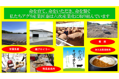 現在は放牧豚を使用した加工品の製造販売のほか、精肉加工事業、惣菜製造、惣菜販売直売所の経営、預託養豚事業など事業を拡大して六次産業化に取り組んでいます。