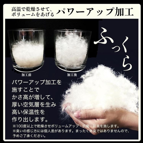 ダウンパワーは400と、とてもボリュームのあるダウンです。海外で洗浄した後、再度日本国内でパワーアップ加工(高温スチーム加工)をしていますので清潔で安心。