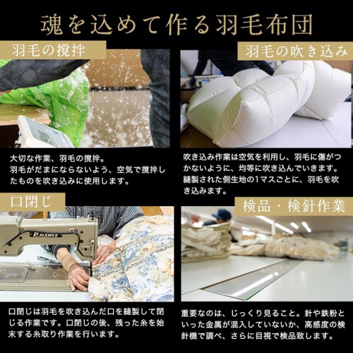 羽毛の清潔さを測る基準清浄度は1000mm以上です。中羽毛量は1300gとたっぷりなので暖かくご使用いただけます。またダウンを抑え込まないよう通常の倍のマチの高さ100mm(通常は40mm~50mm)にした規格外のかさ高を誇る羽毛ふとんで圧倒的なボリューム。羽毛の入れ方も体にあたる中央部を厚めにしており、一枚ずつ作る、手作りならではの品質です。