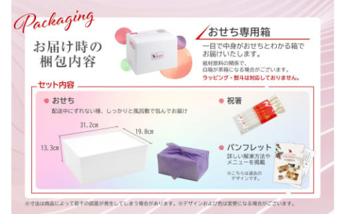 - おせち二段(4~5人前)、祝箸、お品書き・解凍方法