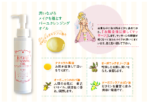 潤いながらメイクを落とす馬油配合の「バーユクレンジングオイル」と、伝統的な製法で馬油職人が手作りする「バーユ&セサミソープ」のセットです。