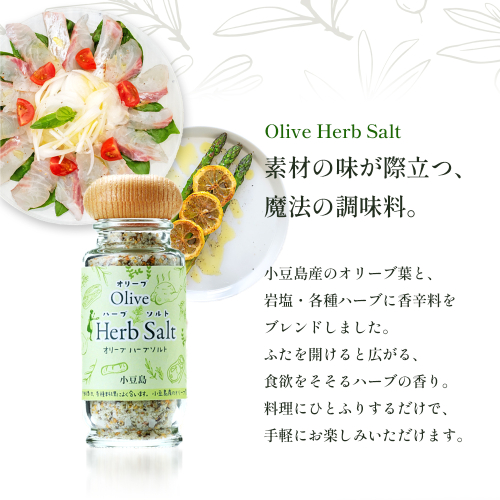 素材の味が際立つ、魔法の調味料。 小豆島産のオリーブ葉と、岩塩・各種ハーブに香辛料をブレンドしました。 ふたを開けると広がる、食欲をそそるハーブの香り。 料理にひとふりするだけで、手軽にお楽しみいただけます。 パスタ、卵料理、野菜炒め、サンドイッチ、フライドポテト、唐揚げなど、さまざまな料理にご使用ください。 味がいっそう引き立ちます。 地場産品基準( 総務省 告示 第 179 号 第 5 条 - 3号) 小豆島内で生産されたオリーブ葉を使用し製造された調味料です。