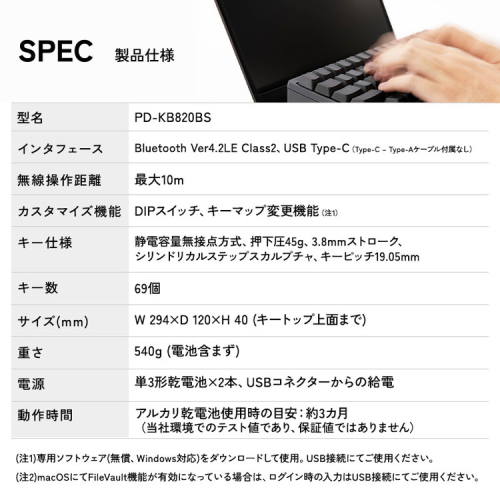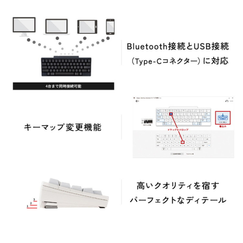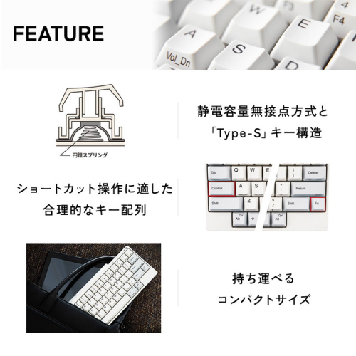 高速入力に最適なチャタリングのない静電容量無接点方式、長時間の使用でも疲れない理想的なキータッチと長寿命、Bluetooth接続とUSB接続(Type-C)、キーマップ変更機能、Speed(高速タイピング性)とSilent(静粛性)に優れる「Type-S」のキー構造。