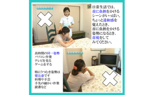 日常生活では、首に負担をかけるシーンがいっぱい。ちょっと違和感を覚えたとき、首に負担をかける姿勢になるとき、首枕をしてみてください。長時間の同一姿勢、パソコン作業、テレビを見る、ゲームをする。特にうつむき姿勢は、要注意です。料理や手芸、手先の細かい作業、読書など。