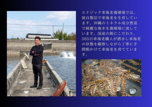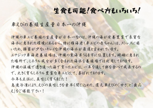 沖縄の温暖で透き通った海で育ったエビは、一年を通して餌を食べて成長するので、大きく育ちミネラル豊富な車エビとして、喜ばれております。