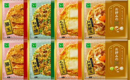- ・豚玉、もちチーズ、月見豚玉 (お好み焼250g、特製ソース25g、薬味〈削り節・青さ粉〉0.5g) 各種2枚