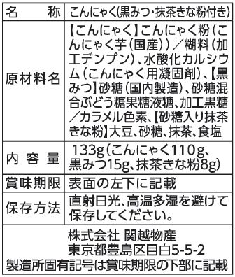 ◇ 商品説明文 こんにゃくをわらびもち風にもちもち食感に仕上げました。冷やしても美味しい、夏の定番和風デザートです。別添の抹茶入りのきな粉と黒蜜をお好みでかけてお召しあがりください。 提供元:関越物産 提供地:すべて埼玉県毛呂山町 ◇原材料 【こんにゃく】こんにゃく粉(こんにゃく芋(国産))/糊料(加工デンプン)、水酸化カルシウム(こんにゃく用凝固剤) 【黒みつ】砂糖(国内製造)、砂糖混合ぶどう糖果糖液糖、加工黒糖/カラメル色素 【砂糖入り抹茶きな粉】大豆、砂糖、抹茶、食塩