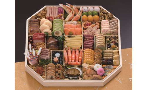 くるみ甘露煮、生ハム、紫キャベツのピクルス、タコと野菜のマリネ、かに爪、わかめ、手まり餅、若桃甘露煮、杏子甘露煮、胡麻ポテト、地どりのテリーヌ、海老のマヨ風味、鶏中華テリーヌ、酢豚、オリーブ、スモークサーモントラウト、オニオンマリネ、焼野菜のトマトマリネ、ミニッツチーズサーブ、海老とブロッコリーのテリーヌ、イタリアンソーセージ、叉焼、カシューナッツ飴炊き、中華くらげ、牛しぐれ笹包み、ぶり照焼、味付数の子、つぶ貝黄金和え、ローストビーフ、ほうれん草と若鶏のテリーヌ、キノコとアサリのアヒージョ、白身魚のアクアパッツァ、海鮮サラダ、合鴨スモークピック、ローストポーク、ブロッコリーバジル香味、黒豆 梅型寒天添え、祝海老、伊達巻、焼帆立、たたきごぼう、椎茸旨煮、一口焼湯葉、味付いくら、帆立ひもの柚子和え、鶏肉八幡巻、蓮根の甘辛和え、あわび旨煮、小松菜の彩り和え、阿波すだち鶏の照焼、花餅 紅梅、花餅 白梅、赤魚西京焼、にしん甘酢漬