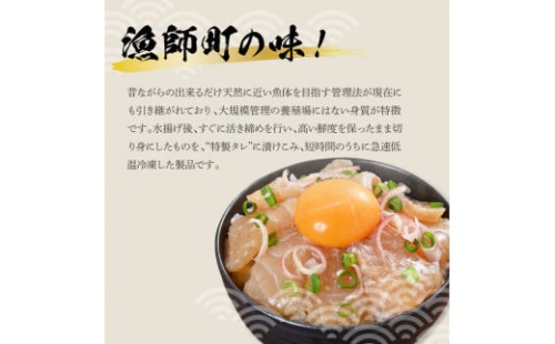 昔ながらの出来るだけ天然に近い魚体を目指す管理法が現在にも引き継がれており、大規模管理の養殖場にはない身質が特徴です。水揚げ後、すぐに活き締めを行い、高い鮮度を保ったまま切り身にしたものを、“特製タレ”に漬けこみ、短時間のうちに急速低温冷凍した製品です。 解凍しご飯にかけるだけで、漁師町でしか味わえないような新鮮な漬け丼がいただけます。お好みで、ネギ、刻みのり、わさび等を載せてお召し上がり下さい。お茶漬けとしてもお召し上げり頂けます。 原材料:真鯛、醤油加工品(みりん、醸造調味料、醤油(大豆・小麦を含む)、砂糖、昆布)、ごま