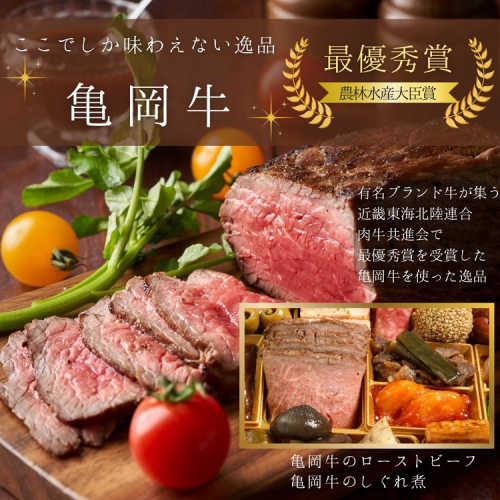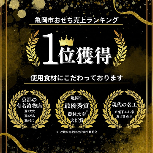 (株)もりのごぼう醤油漬けとだしおりーぶ、(株)大安の竹の子しぐれ煮、京菓子ふじ幸あずきの里の花びら餅と丹波黒豆煮、薬師庵(株)の鶏ごぼういなりときのこ旨煮、(株)近為の菜の花漬け、(株)サンフェステの紫芋焼酎と竹岡醤油を使用したあわび煮、ひら山の牛タンシチュー、亀岡牛のローストビーフやしぐれ煮、京都・亀岡産九条ねぎのすき焼き風煮、京丹波産の大黒本しめじ煮、(株)ヤマモトの丹波黒どり炭火焼など、京都丹波の食材・逸品を取り入れた和洋風おせち料理です。