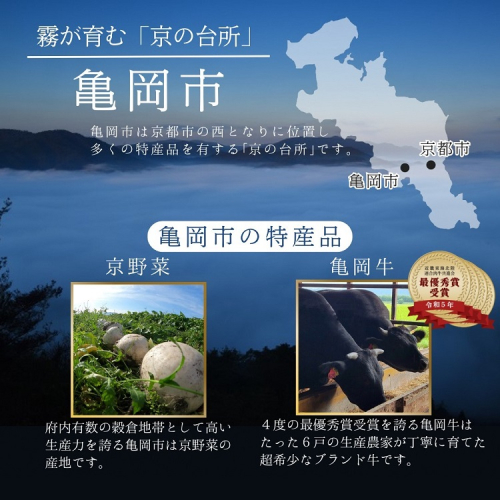 また、古くから城下町として栄え、足利尊氏や明智光秀など日本の歴史が変わる発信点となったまちでもあります。 秋から春にかけては、亀岡盆地一帯に発生する「丹波霧」が、亀岡を象徴する風景として知られています。