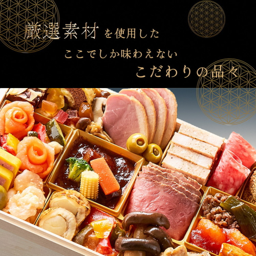 きんとん(薩摩芋ペースト、砂糖、水あめ、還元水あめ、寒天)(国内製造)、牛タンシチュー、彩り野菜のバーニャカウダマリネ(グリル野菜ミックス(ズッキーニ、赤ピーマン、黄ピーマン、ナス)、4種豆ミックス(白インゲン豆、ひよこ豆、赤インゲン豆、インゲン豆)、その他)、亀岡牛のローストビーフ、丹波黒豆煮・金箔添え、ホワイトパストラミ(鶏肉、豚脂、その他)、宇治抹茶金箔ようかん、中華くらげ、なます(大根、人参、醸造酢、その他)、菜の花漬け、ごま団子、中華わかめ、ラタトゥイユ(ミックス野菜(ズッキーニ、赤ピーマン、黄ピーマン、なす)、トマトジュース漬け、玉ねぎ、植物油脂、その他)、丹波黒どり炭火焼、伊達巻、海老チリソース、花びら餅(砂糖、もち米粉、手亡、牛蒡、水あめ、その他)、合鴨スモーク、サワラ西京焼、竹の子しぐれ煮、亀岡牛のしぐれ煮、焼豚、豚角煮、ウッドロール(シュー生地、乳等を主要原料とする食品、生クリーム、栗甘露煮、全卵、その他)、鶏ごぼういなり、一口にしん昆布巻、花こんにゃく煮、市松チーズ<南瓜ムース包み>(プロセスチーズ、魚肉すり身、南瓜、豚肉、鶏肉、その他)、たこ照焼、スモークサーモントラウト、渋皮栗甘露煮、松前漬け(塩漬人参、昆布、砂糖、醤油、するめ、その他)、きのこ旨煮、チェダーシュリンプサラダ(ボイルエビ、半固体状ドレッシング、プロセスチーズ、その他)、からし菜昆布漬け、肉団子、あわび煮、ピリ辛小胡瓜、大黒本しめじ煮、海老旨煮、味付数の子、金柑甘露煮、ミックスドライフルーツ(フルーツ果肉(マンゴー、いちご、メロン、パパイヤ、キウイフルーツ、パインアップル)、砂糖、パインアップル果汁)、カシューナッツの飴だき、ボロニアソーセージ、ひも付帆立燻製、味付いくら、ローストビーフソース(砂糖、醤油、大根、醸造酢、玉ねぎ、その他)、ビーンズデミグラスソース煮、ごぼう醤油漬け、バイ貝煮、グリーンオリーブ、田作り煮(片口いわし、砂糖、醤油、水あめ)、アーモンドショコラ、だしおりーぶ(オリーブ、山椒、漬け原材料(砂糖・ぶどう糖果糖液糖、醤油、その他))、九条ねぎのすき焼き風煮/調味料(アミノ酸等)、酸味料、増粘剤(加工デンプン、増粘多糖類)、ソルビトール、pH調整剤、着色料(クチナシ、カラメル、金箔、モナスカス、黄4、青1、赤102、赤105、赤106、カロチノイド、パプリカ色素、コチニール、銅葉緑素、赤40)、香料、酸化防止剤(V.C)、リン酸塩(Na,K)、加工デンプン、トレハロース、カゼインNa、発色剤(亜硝酸Na、硝酸K)、香辛料抽出物、甘味料(ステビア、ソルビトール、カンゾウ)、漂白剤(次亜硫酸Na)、乳化剤、グリシン、安定剤(加工デンプン、増粘多糖類)、酵素、ゲル化剤(カラギーナン)、豆腐用凝固剤、保存料(ソルビン酸K、亜硫酸塩、ソルビン酸)、糊料(加工デンプン)、水酸化Ca、焼成Ca、くん液、酒精、トウガラシ抽出物、ビタミンB₁、酢酸(Na)、乳酸Ca、(一部にえび・かに・小麦・卵・乳成分・アーモンド・あわび・いか・いくら・カシューナッツ・キウイフルーツ・牛肉・ごま・さけ・さば・大豆・鶏肉・豚肉・りんご・ゼラチンを含む)