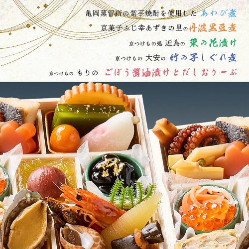 もりのごぼう醤油漬け、たこ照焼、サワラ西京焼、大安の竹の子しぐれ煮、花こんにゃく煮、伊達巻、宇治抹茶金箔ようかん、京菓子ふじ幸あずきの里の花びら餅、金柑甘露煮、味付いくら、なます、きんとん、渋皮栗甘露煮、京菓子ふじ幸あずきの里の丹波黒豆煮・金箔添え、薬師庵の鶏ごぼういなり、近為の菜の花漬け、サンフェステの紫芋焼酎と竹岡醤油を使用したあわび煮、田作り煮、海老旨煮、バイ貝煮、味付数の子、一口にしん昆布巻、松前漬け